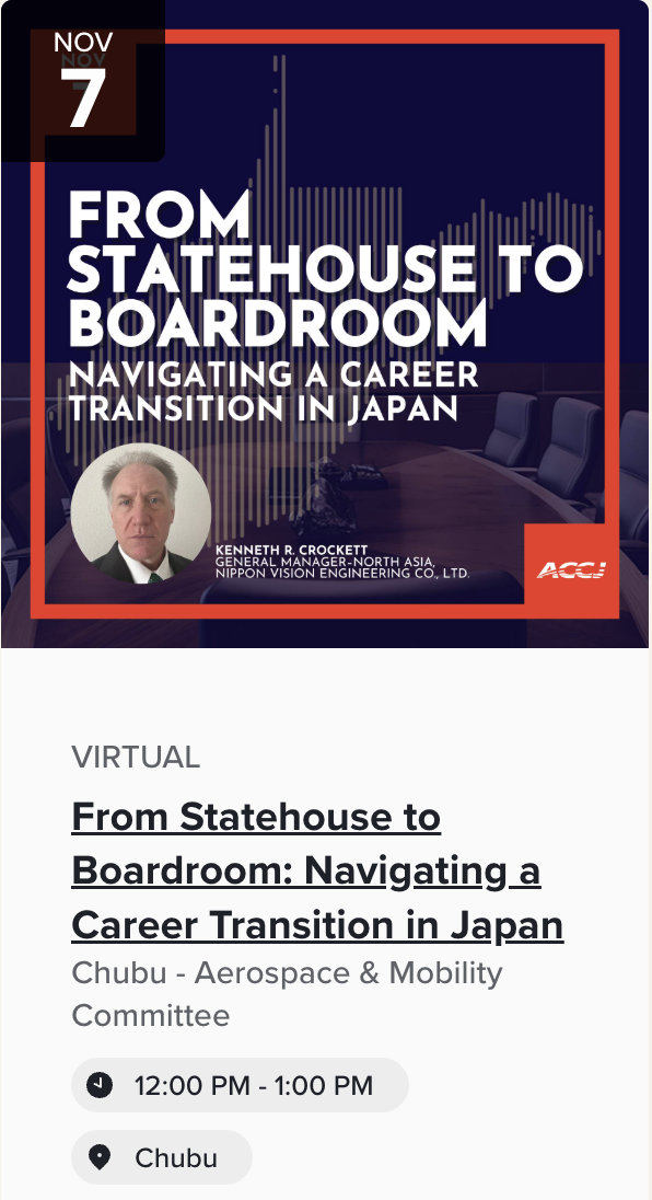 Provides a venue for industry news and knowledge sharing, as it relates to aerospace, automotive, and other manufacturing-related industries. As the Chubu region is the home for manufacturers in multiple industries, this committee endeavors to build lasting relationships and facilitate sustained growth for member companies in such fields. Event topics range from defense procurement policy discussions to next-generation technology presentations. Other activities include training workshops and networking events. While committee meetings are limited to industry insiders, most committee events are open to the general membership and guests, with a handful of closed sessions for committee members or ACCJ members only. This committee is operated by its leadership team with significant input from committee members.