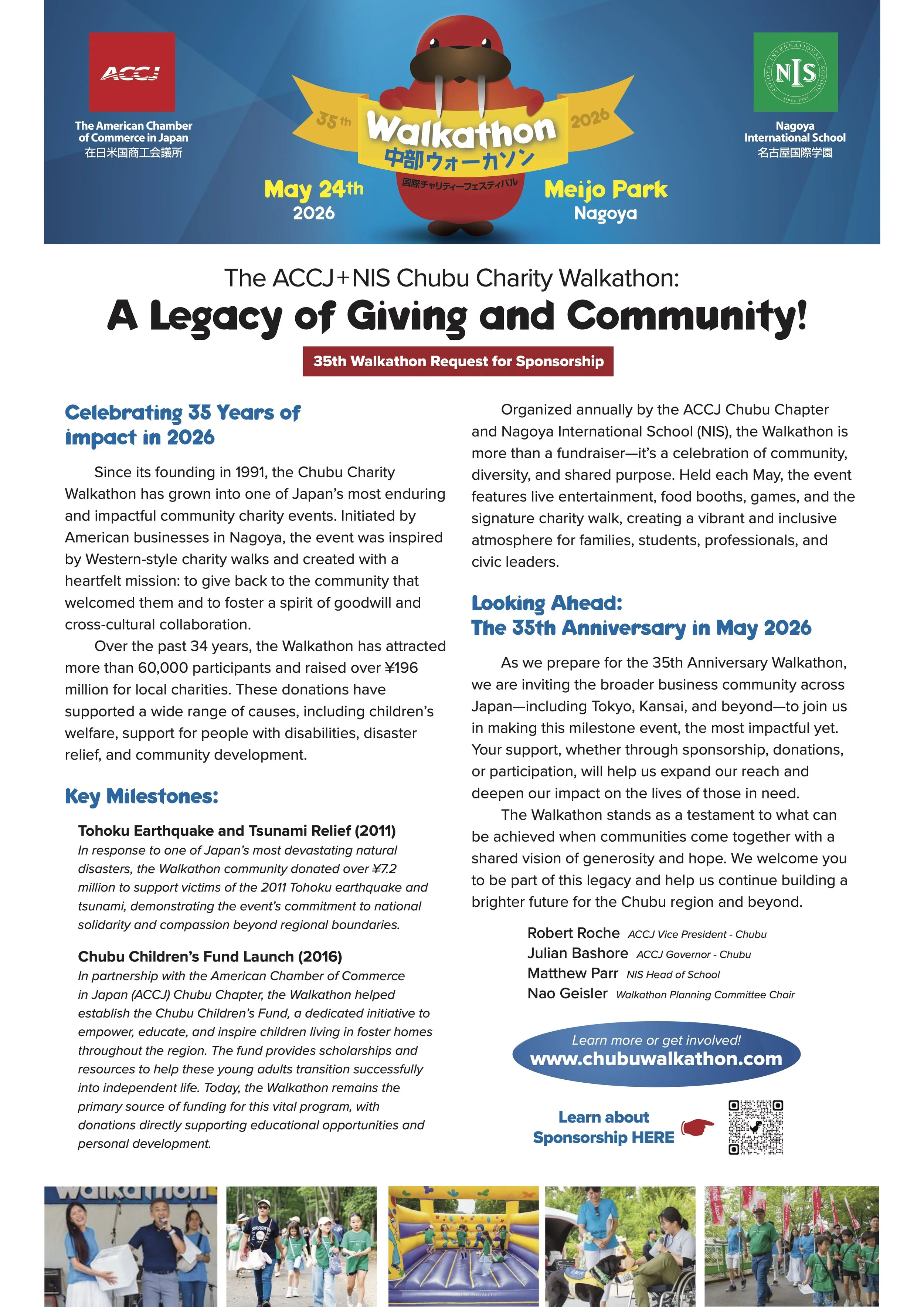 We are also focused on the Chubu Children's Fund, which was established by the ACCJ Chubu Chapter in 2016. For details, please visit the Chubu Children’s Fund