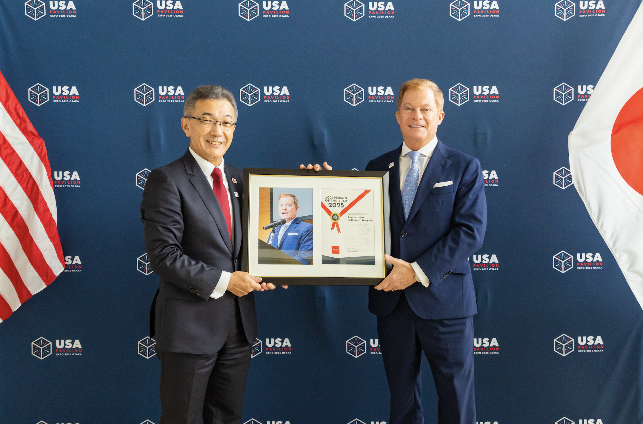 Ambassador Grayson played an instrumental role in advancing the U.S.-Japan partnership as Commissioner General of the USA Pavilion at the 2025 Expo Osaka, Kansai. His leadership fostered a deeper exchange of ideas, culture, and values, exemplifying the spirit of the Expo. Guided by the theme of Imagine What We Can Create Together, the USA Pavilion welcomed nearly two million visitors to experience the breadth of American innovation and entrepreneurship, from space exploration to artificial intelligence and next-generation technologies.