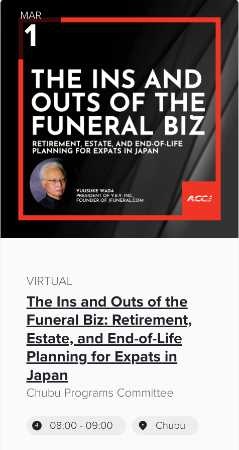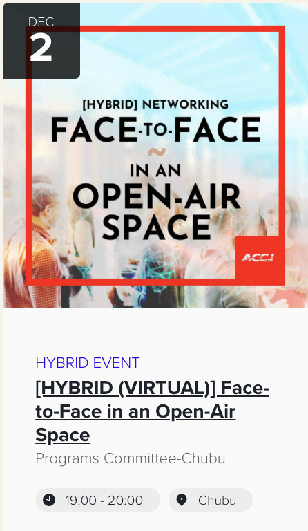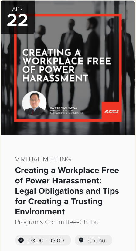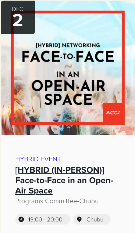 At its core, the Programs Committee works to create a platform to support both local and international business with quality programming to build relationships among executives, develop and strengthen executive skills in employees at all levels, and spread the economic and business know-how possessed by both members and guest speakers that are invited regularly. Within the wider objectives, two specific areas are also supported: young professionals and women. The Young Professionals Forum focuses on early-career mentoring and executive training, while Women in Business promotes programs around empowerment, advocacy, and mentorship. By focusing on these areas, the committee can promote a healthy Chubu business environment that is diverse and balanced. The committee holds monthly meetings and events that provide a variety of programming that covers all areas.